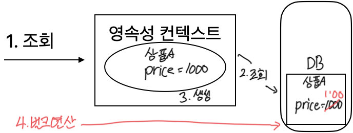 위의 코드를 실행하면 영속성 컨텍스트에는 가격이 2000원으로 변경되지만 아직 데이터베이스에는 반영되지 않아 1000원으로 남아있다. 이 상태에서 JPQL을 호출해서 가격이 2000원인 상품을 조회하면 아까 바꾼 item이 포함되어 조회된다. 이는 기본 플러시 모드가 FlushTypeMode.AUTO이기 때문이다. AUTO 상태에는 커밋을 할 때와 쿼리를 실행하기 직전에 영속성 컨텍스트가 플러시된다. 따라서, 방금 2000원으로 수정한 아이템을 조회할 수 있다.