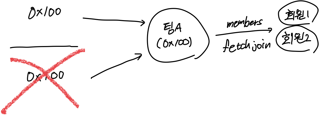 JPQL로 데이터베이스에서 조회한 엔티티가 영속성 컨텍스트에 이미 있으면 JPQL로 조회한 결과를 버리고 영속성 컨텍스트에 있는 엔티티를 반환한다. 이 때 식별자 값을 비교한다.