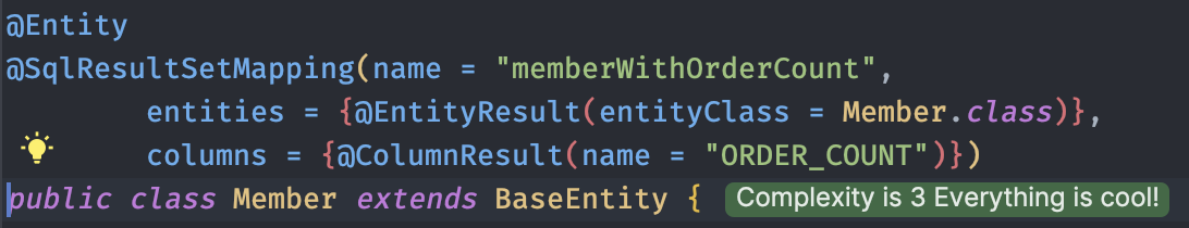 매핑이 복잡한 Named 네이티브 쿼리를 작성할 경우 Named 네이티브 쿼리의 속성 중 resultSetMapping으로 매핑할 대상을 지정할 수 있다.