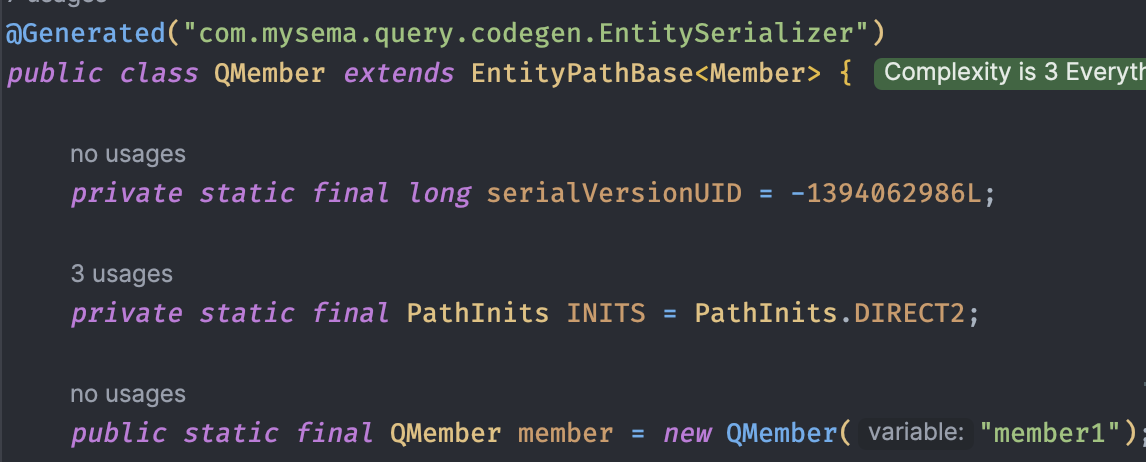 QueryDSL 역시 어노테이션 프로세서를 사용해 쿼리 전용 클래스를 만들어야 한다. QMember는 Member 엔티티 클래스를 기반으로 생성한 QueryDSL 쿼리 전용 클래스이다.