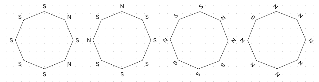 톱니바퀴와 맞닿은 다른 톱니바퀴의 극이 서로 다르다면 → 맞닿은 톱니바퀴는 해당 톱니바퀴의 반대방향으로 회전